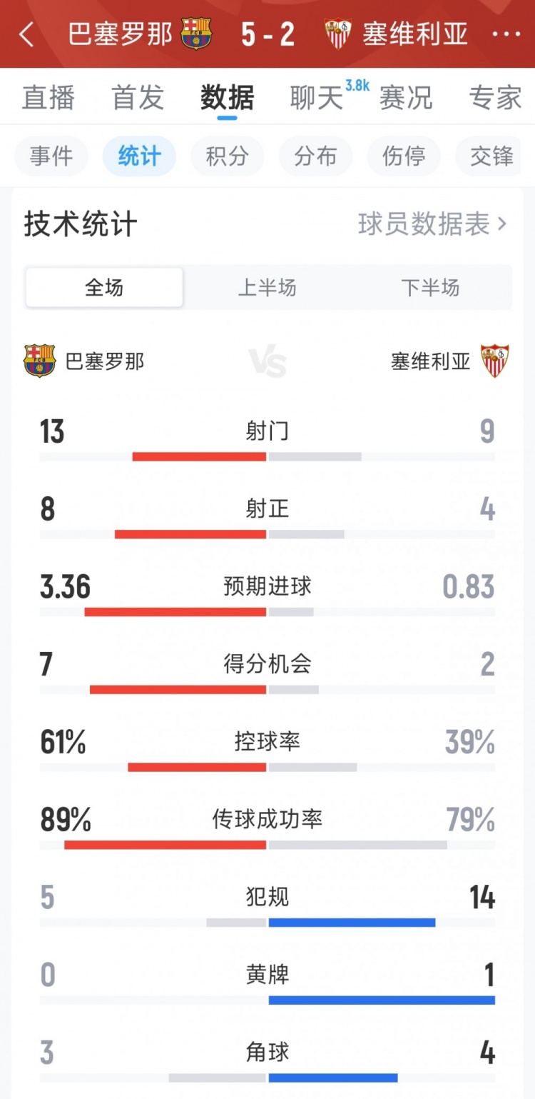 直播吧3月16日訊 在本輪西甲,巴薩5-2擊敗塞維利亞,以下為雙方全場(chǎng)數(shù)據(jù)對(duì)比: