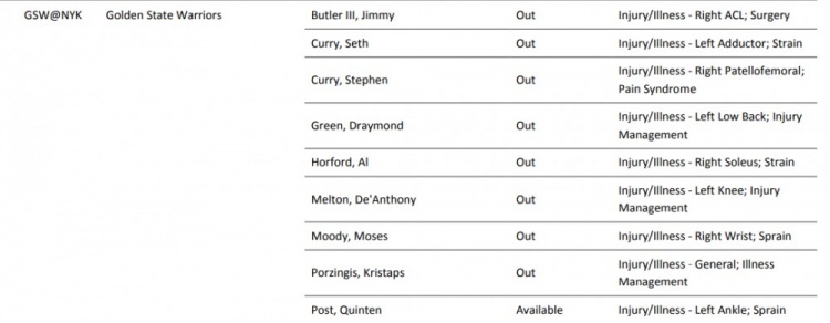 勇士今日傷兵滿營,庫里、巴特勒、 波爾津吉斯、梅爾頓、穆迪、追夢、霍福德和賽斯·庫里8名大將全部缺戰(zhàn)。