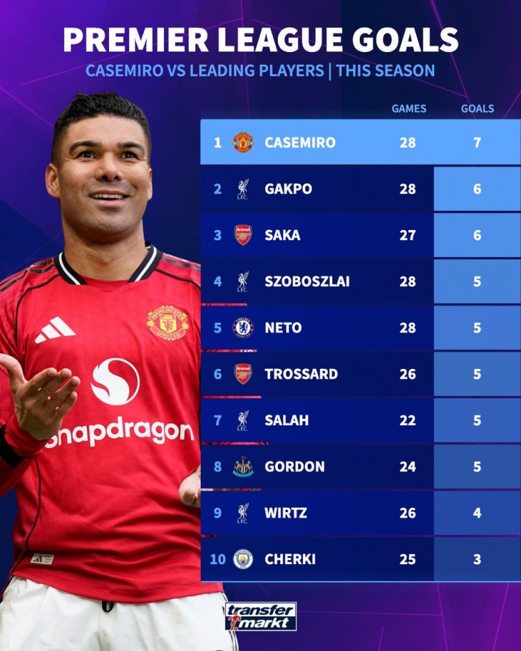 直播吧3月16日訊 英超第30輪比賽,卡塞米羅破門,曼聯(lián)主場(chǎng)3-1擊敗維拉。德國(guó)轉(zhuǎn)會(huì)市場(chǎng)統(tǒng)計(jì)了卡塞米羅與部分頂級(jí)球員本賽季英超的進(jìn)球數(shù)量。