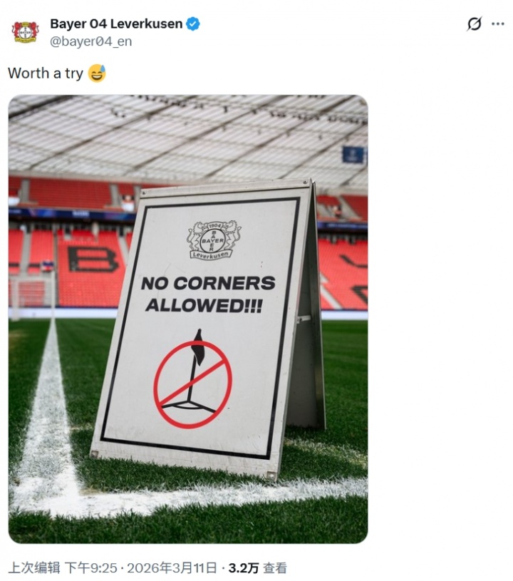 勒沃庫森官推今日曬P圖,將球場劃線更改,并將角旗P上了阿森納logo。同時寫道:“這樣更好”