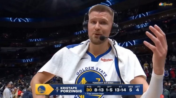 本場比賽,波爾津吉斯出戰(zhàn)26分鐘,13中8,14罰13中砍下勇士生涯新高的30分外加5板4助2斷3帽。