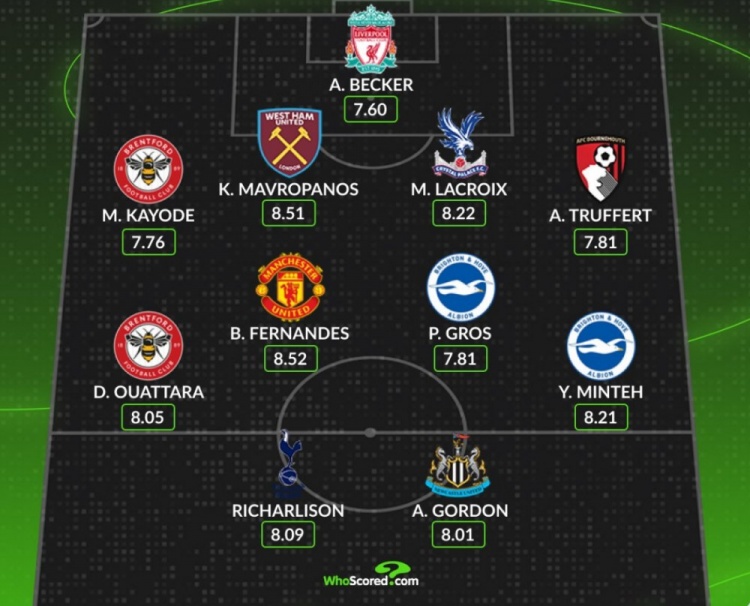 中場:瓦塔拉(布倫特福德)、B費(fèi)(曼聯(lián))、格羅斯(布萊頓)、明特(布萊頓)