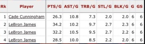 過(guò)去6場(chǎng),坎寧安場(chǎng)均26.3分7.3板10.8助2斷2帽,歷史第二位能在6場(chǎng)比賽區(qū)間打出場(chǎng)均25分5板10助2斷2帽,此前僅詹姆斯做到,他做到3次。
