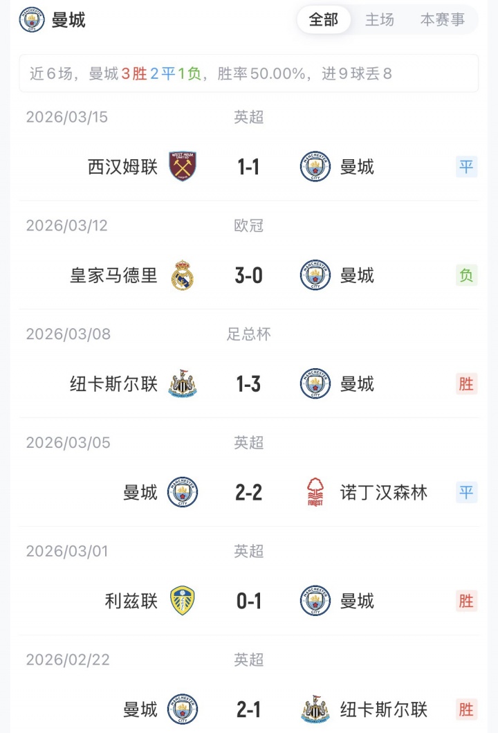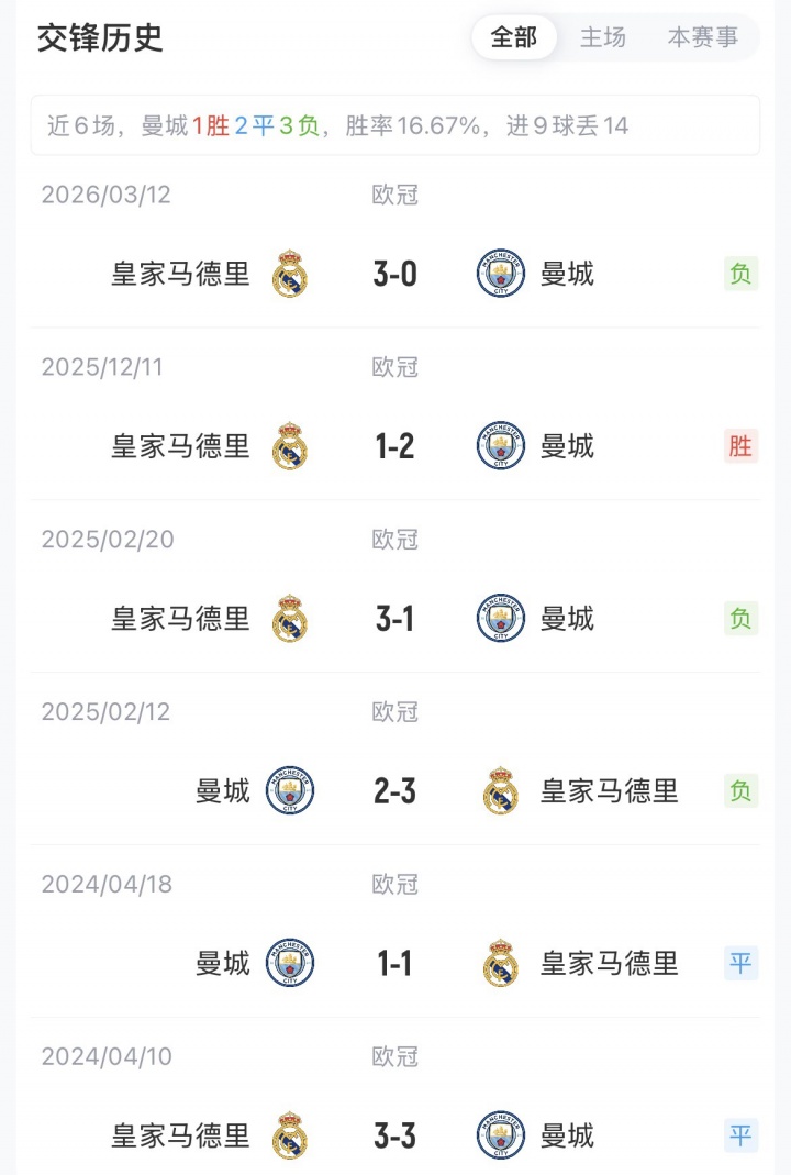 曼城首回合0-3不敵皇馬,兩隊歐冠已交手16次,曼城5勝4平7負(fù)。此前的6次淘汰賽對決,皇馬4次晉級,曼城2次晉級。