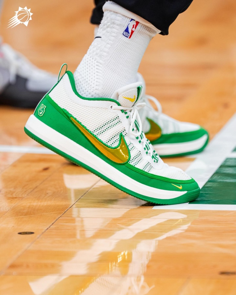布克穿著的是一雙俄勒岡大學(xué)的PE配色Book 2 “Oregon” PE,球鞋配色采用了俄勒岡的黃綠色系搭配,同時(shí)鞋后跟外側(cè)有俄勒岡大學(xué)縮寫“OU”。