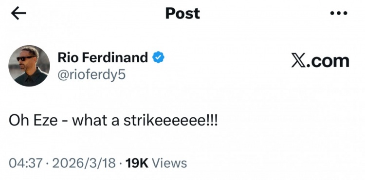 曼聯(lián)名宿費(fèi)迪南德在社媒對這個進(jìn)球進(jìn)行稱贊,他寫道:“哦埃澤,多么精彩的一記世界波!”