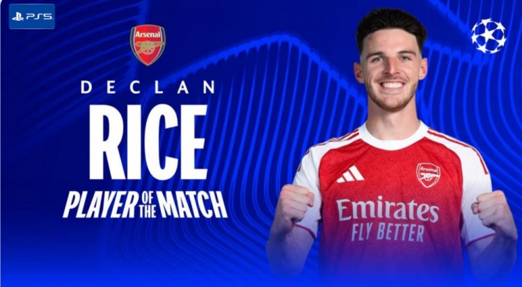 賴斯本場比賽為阿森納踢滿全場,并打進(jìn)一球,歐冠官方宣布,他當(dāng)選此役全場最佳球員。
