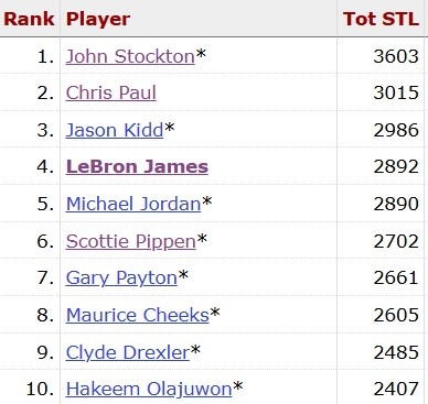 詹姆斯生涯總搶斷數(shù)(常規(guī)賽+季后賽)超越喬丹 上升至歷史第四