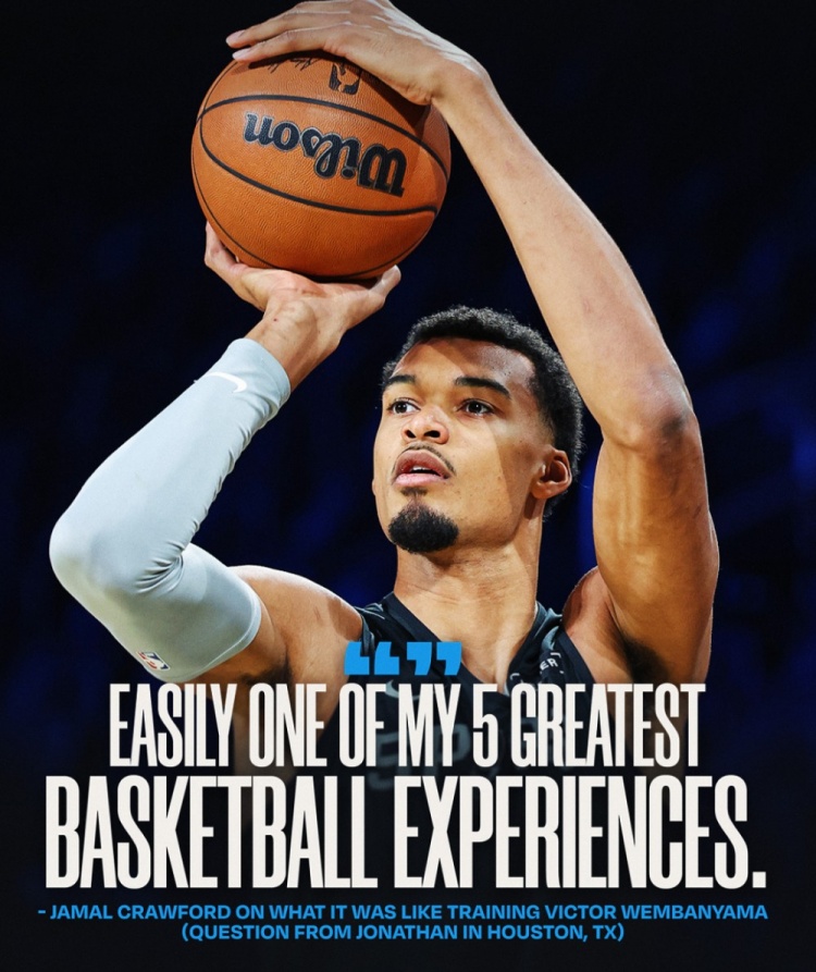 克勞福德:以他的思維方式,幾乎可以說他教會(huì)了我一些東西。老實(shí)說,我不能說我教了他什么。而且我不確定他是否希望我透露我們?cè)谝黄鹩?xùn)練的內(nèi)容。能夠和他在球場(chǎng)上一起訓(xùn)練,并且在場(chǎng)下共度那么多時(shí)光,這對(duì)我來說是一種榮譽(yù)。我之前說過,這是我籃球生涯中最棒的五次經(jīng)歷之一。