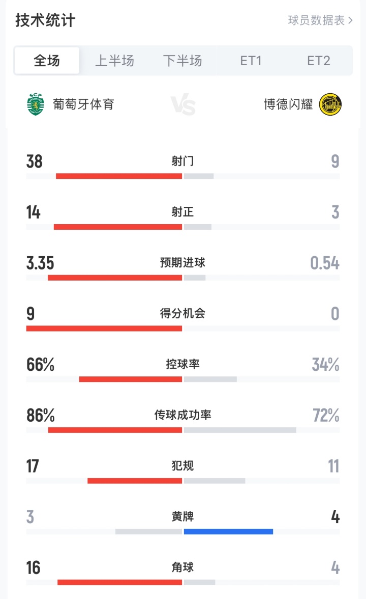葡萄牙體育vs博德閃耀次回合全場數(shù)據(jù):