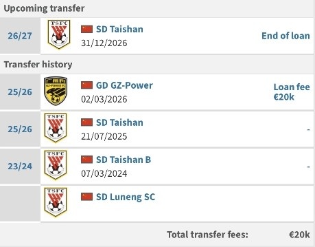 德轉(zhuǎn)王昊斌個(gè)人頁(yè)面顯示,他于2月3日以2萬(wàn)歐元的租借費(fèi),從山東泰山租借加盟廣州豹。租借合同為期一個(gè)賽季。