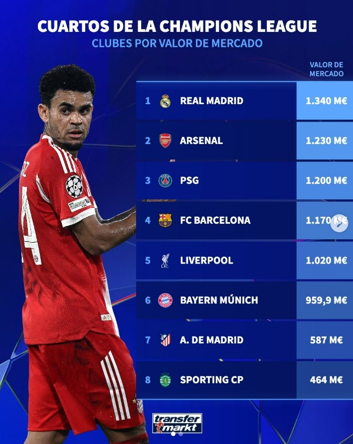 直播吧3月19日訊 本賽季歐冠8強全部產(chǎn)生,德轉也列出8強球隊身價榜,具體如下:
