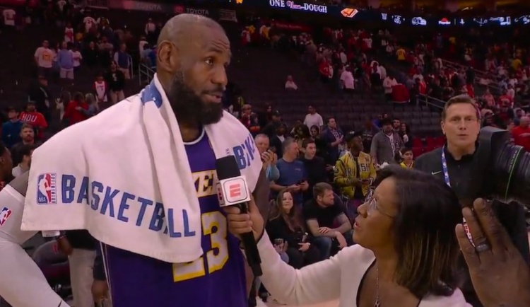 賽后,詹姆斯在場(chǎng)邊接受了記者(Lisa Salters)采訪。他說道:“我本來要立刻回更衣室冰敷(手肘),但我愛你,你太棒了, 我必須回來接受你的采訪?!?/p>