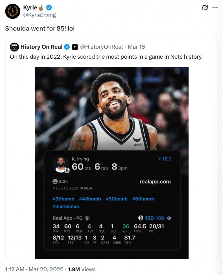 在2022年的3月17日,歐文得到60分,籃網(wǎng)隊史單場比賽新紀(jì)錄。