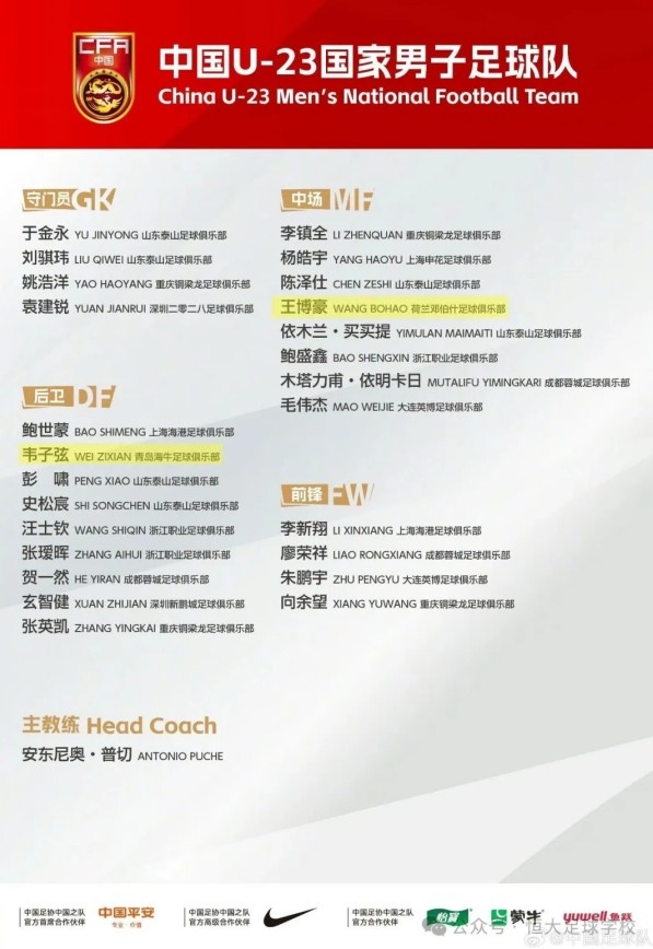 韋子弦、王博豪入選U23集訓(xùn)名單。為備戰(zhàn)2026年名古屋亞運會,隊伍將于3月22日至4月1日赴陜西省西安市組織集訓(xùn)并參加西安國際足球錦標(biāo)賽。