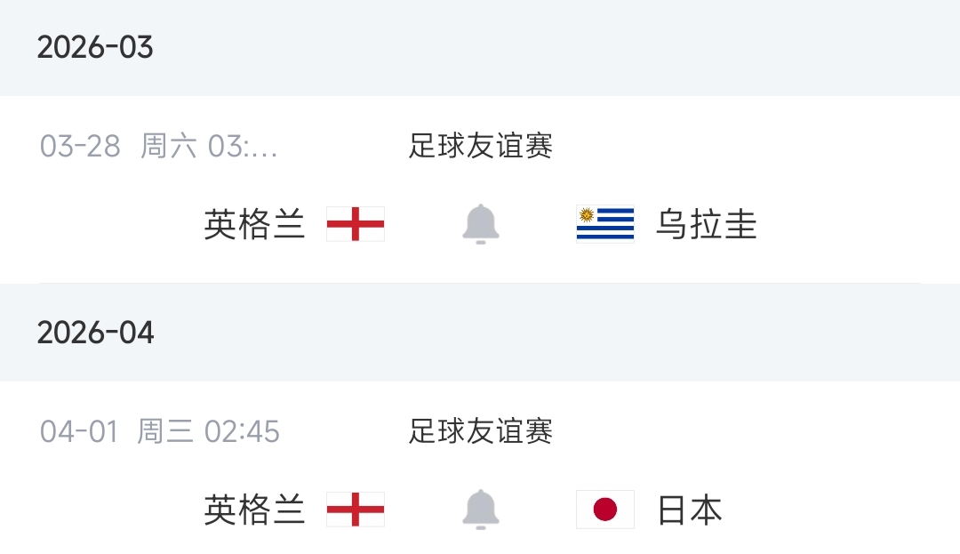 英格蘭本月底將坐鎮(zhèn)溫布利球場進(jìn)行兩場熱身賽,分別是北京時(shí)間3月28日凌晨3:45對陣烏拉圭、4月1日凌晨2:45對陣日本。