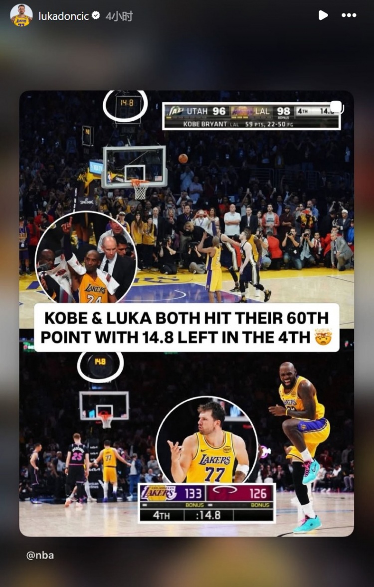 和科比一樣都是在剩余14.8秒的情況下得到第60分!東契奇轉發(fā)