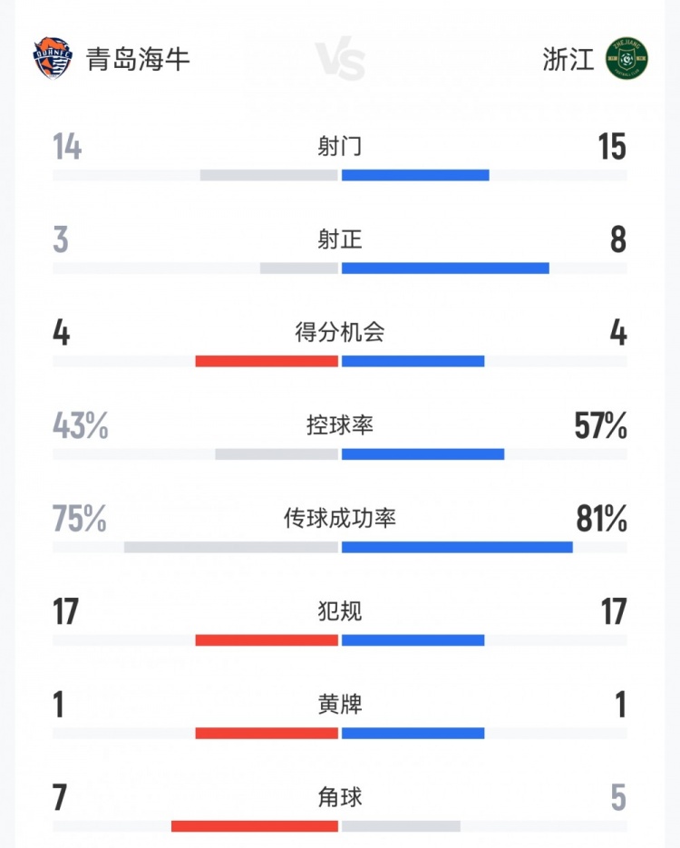 直播吧3月20日訊 本輪中超,青島海牛1-4浙江隊(duì)。雙方全場重點(diǎn)數(shù)據(jù)對(duì)比如下↓(主隊(duì)海牛在前)