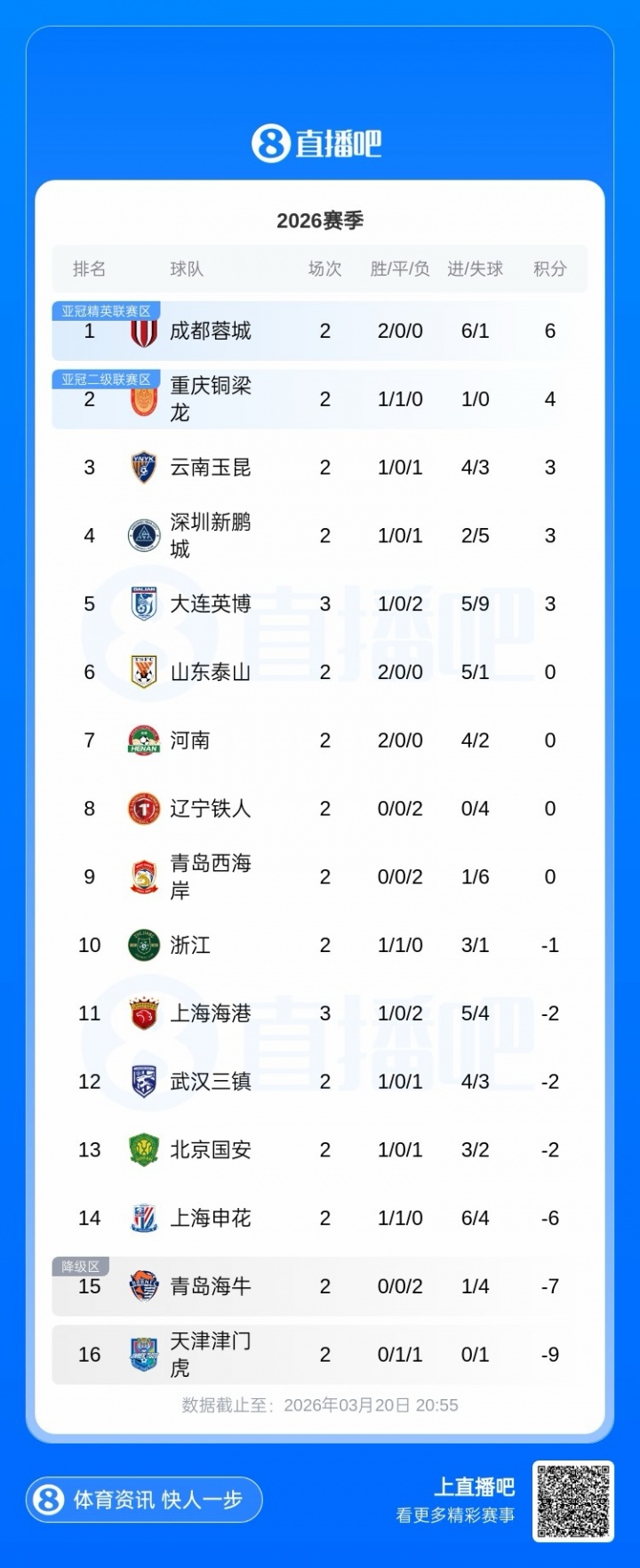 直播吧03月20日訊 今日中超第三輪先賽一場,海港0-1不敵英博,最新積分榜如圖,海港前三輪兩負(fù),目前積分為負(fù)2分。大連英博取得首勝,排在積分榜第5位。