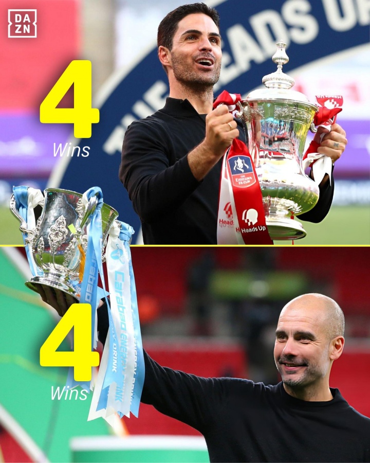 阿爾特塔執(zhí)教阿森納以來,在溫布利4戰(zhàn)全勝。瓜迪奧拉執(zhí)教曼城以來,此前4次聯(lián)賽杯決賽也全部奪冠。