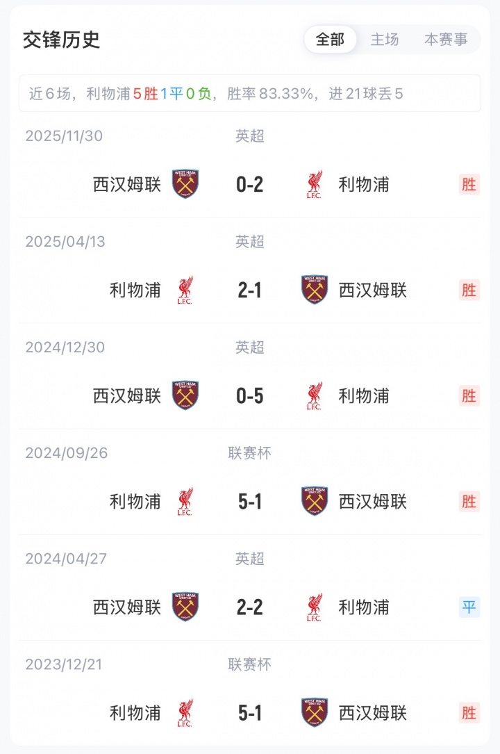 積分榜方面,利物浦近期取得聯(lián)賽兩連勝,目前27輪過后積45分排在英超第6位;西漢姆聯(lián)27輪6勝7平14負(fù),積25分排在英超倒數(shù)第三,處于降級(jí)區(qū)。兩隊(duì)本賽季首回合交手,利物浦客場(chǎng)2-0戰(zhàn)勝西漢姆聯(lián)。