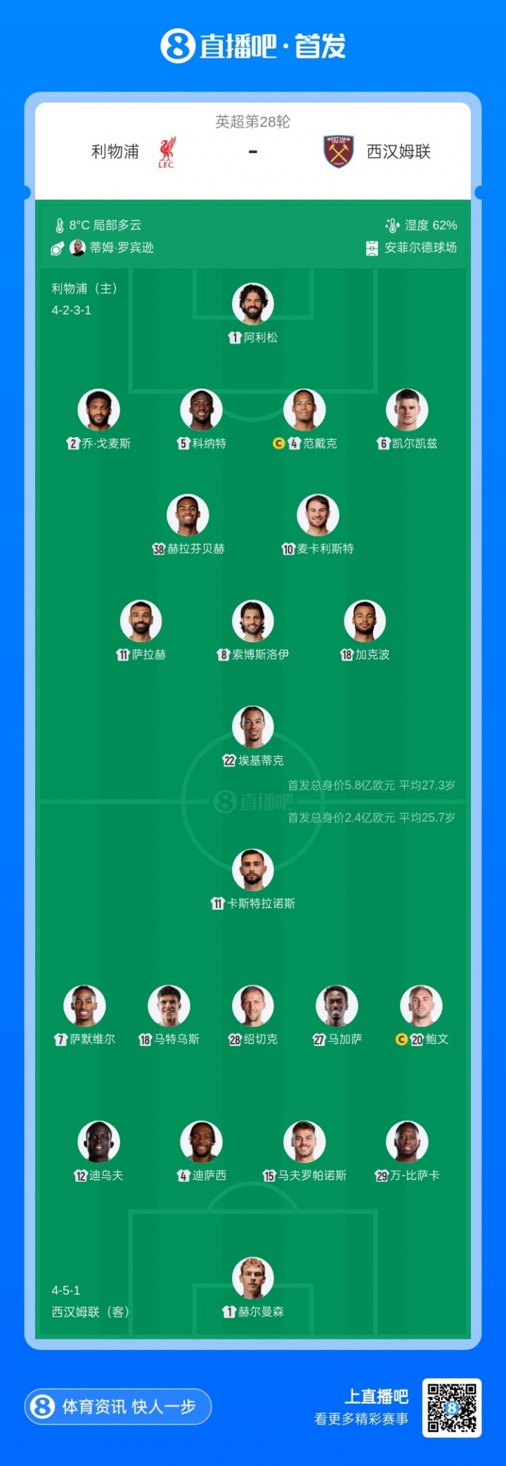 利物浦首發(fā):1-阿利松、2-戈麥斯、4-范戴克、5-科納特、6-凱爾凱茲、8-索博斯洛伊、10-麥卡利斯特、38-赫拉芬貝赫、11-薩拉赫、18-加克波、22-埃基蒂克