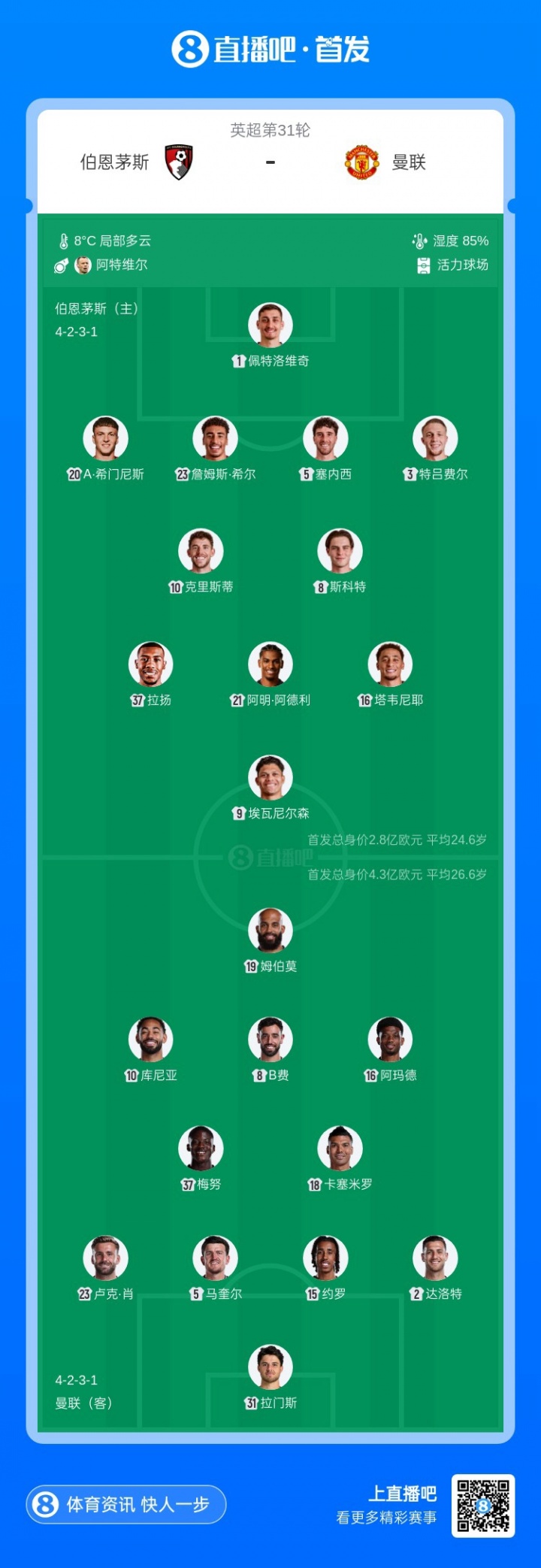 直播吧3月21日訊 英超第31輪,曼聯(lián)客戰(zhàn)伯恩茅斯,賽前首發(fā)公布。