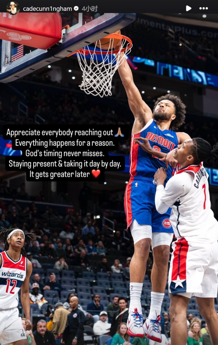 今天,坎寧安曬照并寫道:“感激每個聯(lián)系我的人。凡事皆有其因由。上帝的安排總是恰到好處。保持當(dāng)下,一天一天堅持。我歸來之時會更出色?!?/p>