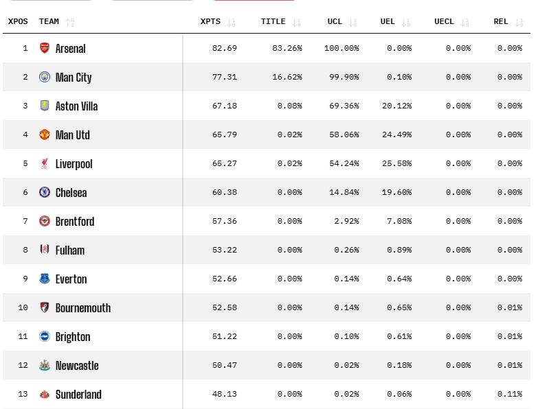 直播吧03月02日訊 英超第28輪結(jié)束,OPTA更新了英超奪冠概率,其中阿森納83.26%領(lǐng)跑,曼城16.62%,維拉0.08%,曼聯(lián)和利物浦0.02%,切爾西0%。
