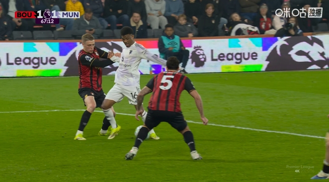 英超第31輪,曼聯(lián)客戰(zhàn)伯恩茅斯。67分鐘,阿瑪?shù)陆麉^(qū)內(nèi)倒地,裁判沒有表示。伯恩茅斯隨后發(fā)動(dòng)反擊扳平比分。