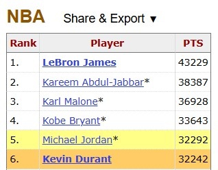 本場比賽過后,杜蘭特常規(guī)賽生涯得分達(dá)到32277,距離超越邁克爾·喬丹只差26分!