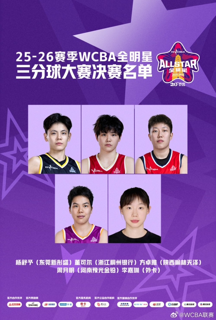 三分球大賽決賽名單出爐:楊舒予(東莞新彤盛)、董可爾(浙江稠州銀行)、方卓雅(陜西榆林天澤)、周月明(河南豫光金鉛)、李嘉琳(外卡)