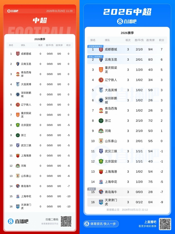 直播吧03月21日訊 中超第3輪全部結(jié)束,目前9支負(fù)分開局的球隊有3隊擺脫負(fù)分,6支球隊仍是負(fù)分情況。
