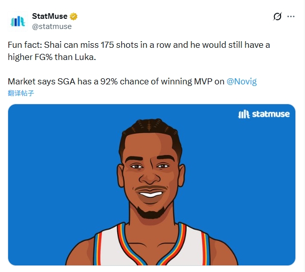 有趣的事實(shí):謝伊(吉爾杰斯-亞歷山大)可以連續(xù)投丟175球,他的投籃命中率依舊高于盧卡(東契奇)。
