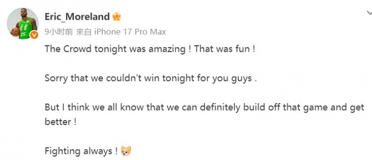 比賽結(jié)束后,莫蘭德在社媒上向球迷們道歉,他寫道:“今晚的觀眾們太棒了!這很有趣!
