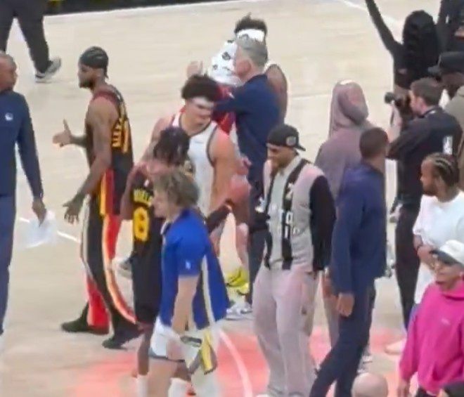 這是庫(kù)明加被交易后首次面對(duì)老東家,賽后他和前隊(duì)友擁抱致意,也和主教練科爾簡(jiǎn)單握手擁抱,最后還和庫(kù)里聊了一會(huì)。
