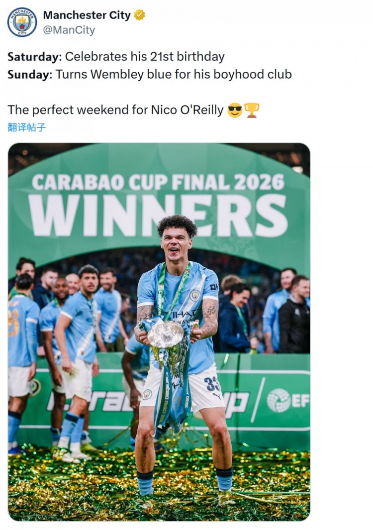 曼城官方社媒曬出奧賴?yán)醣恼掌?,配文:“周六慶祝自己的21歲生日,周日為兒時(shí)的俱樂(lè)部將溫布利染成藍(lán)色,奧賴?yán)耐昝乐苣?。?/p>