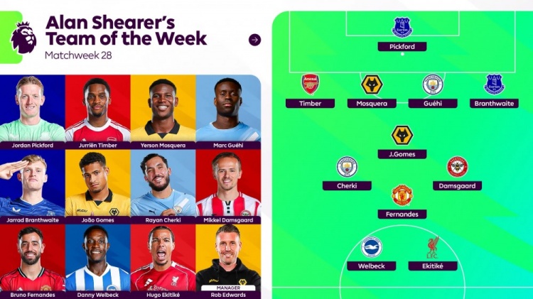 中場:若昂·戈麥斯(狼隊(duì))、謝爾基(曼城)、達(dá)姆斯高(布倫特福德)、B費(fèi)(曼聯(lián))