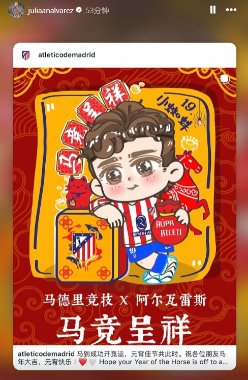 直播吧03月02日訊 今天迎來(lái)元宵節(jié),馬競(jìng)官方社媒曬中文海報(bào)祝福,阿爾瓦雷斯也在個(gè)人社媒轉(zhuǎn)發(fā)。