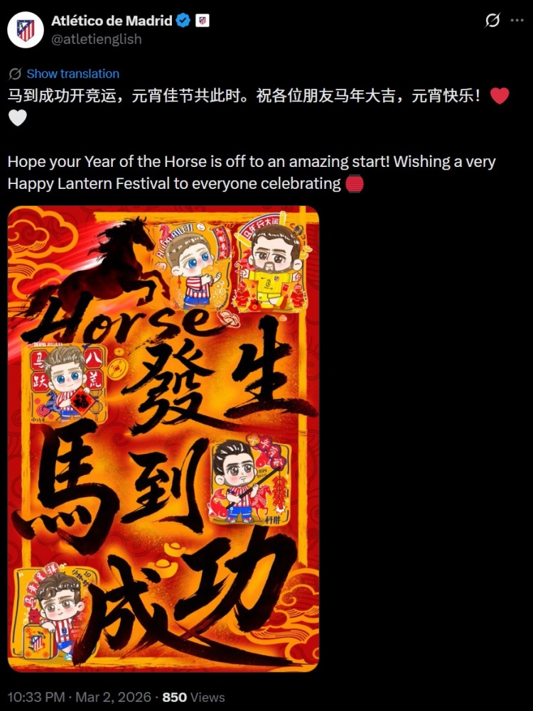 馬競官推用中文寫道:“馬到成功開競運,元宵佳節(jié)共此時。祝各位朋友馬年大吉,元宵快樂!”