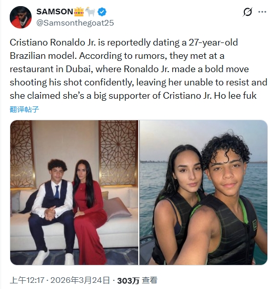 推特網(wǎng)傳C羅兒子、15歲的迷你羅正在與一名27歲的巴西模特約會。這則推文在推特上有300多萬的閱讀量,配圖是迷你羅與一女性的合照。