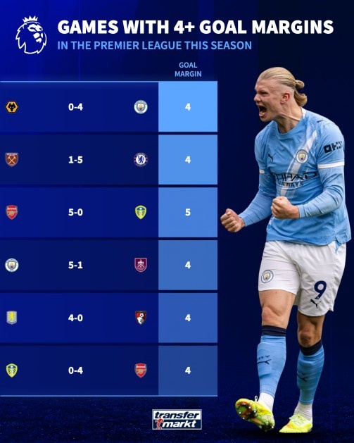 在已經(jīng)進(jìn)行的28輪比賽中,只有六次出現(xiàn)球隊(duì)凈勝四球或以上。此外,只有一場(chǎng)比賽凈勝五球或以上。曼城在賽季初以4-0擊敗狼隊(duì),并在去年九月主場(chǎng)以5-1戰(zhàn)勝伯恩利。領(lǐng)頭羊阿森納在主客場(chǎng)分別以5-0和4-0擊敗了利茲聯(lián)。切爾西在賽季初以5-1擊敗西漢姆聯(lián),維拉在去年十一月以4-0擊敗伯恩茅斯。