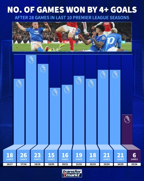 現(xiàn)在,當(dāng)賽季進(jìn)入尾聲時(shí),只有六場(chǎng)比賽凈勝四球或以上,這并不正常。事實(shí)上,與過(guò)去10個(gè)賽季相比,這一數(shù)字明顯較低。上賽季28輪比賽后,有21場(chǎng)比賽凈勝四球或以上。2023-24賽季28輪比賽后,也有21場(chǎng)比賽凈勝四球或以上。自2016-17賽季以來(lái),此前最低的記錄是2019-20賽季的15場(chǎng)。