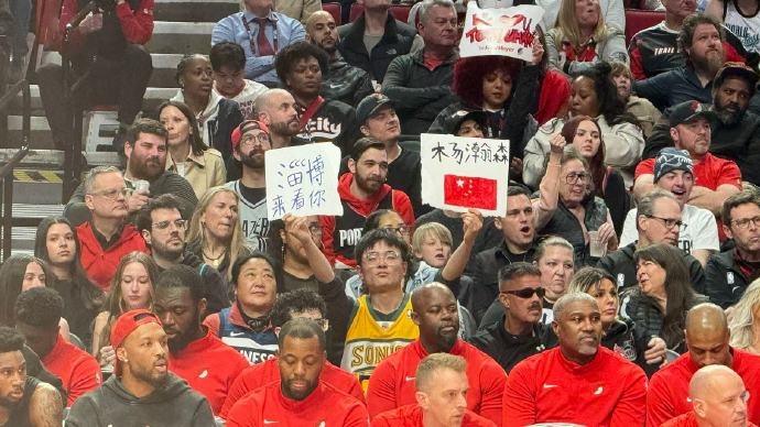 直播吧3月24日訊 NBA常規(guī)賽,開(kāi)拓者134-99大勝籃網(wǎng)。比賽中一位楊瀚森的淄博老鄉(xiāng)到現(xiàn)場(chǎng)助威,高舉國(guó)旗和寫(xiě)有小楊名字的牌子。