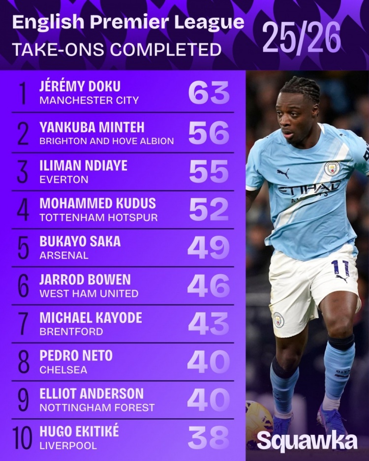 直播吧3月24日訊 數(shù)據(jù)機構(gòu)Squawka統(tǒng)計出了本賽季英超球員過人數(shù)情況,曼城邊鋒多庫以63次居首。