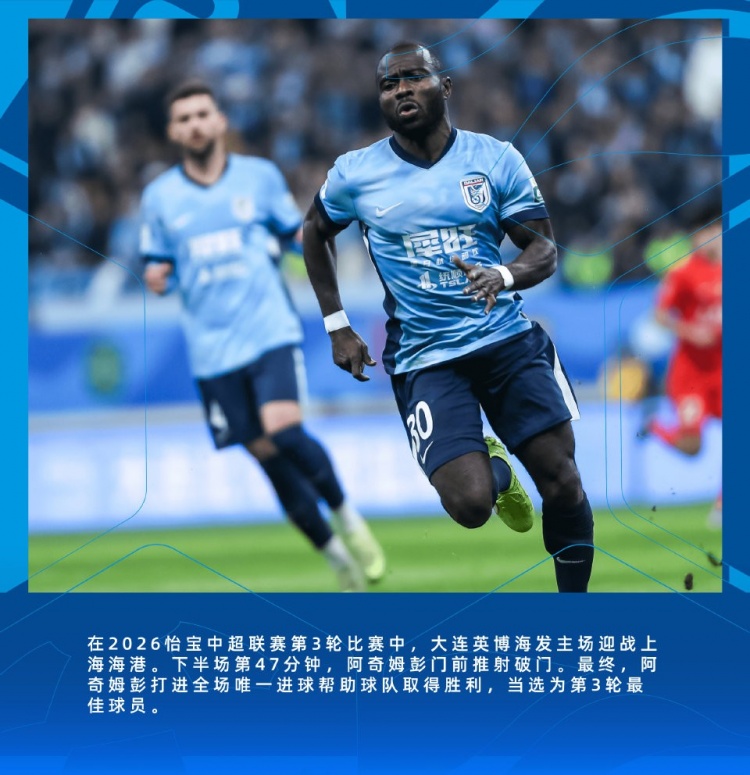 中超第3輪,大連英博主場1-0擊敗衛(wèi)冕冠軍上海海港,比賽第47分鐘阿奇姆彭門前推射破門,憑借這個(gè)進(jìn)球他幫助球隊(duì)取得勝利,當(dāng)選為第3輪最佳球員。
