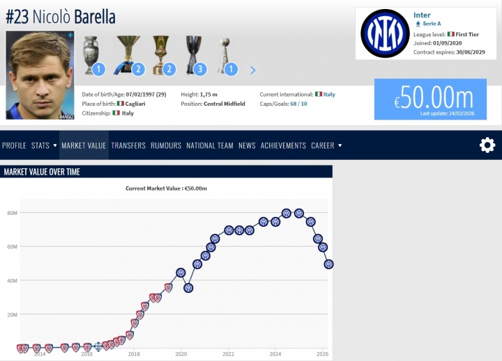 自2024年年底以來,巴雷拉的身價一路從生涯最高的8000萬歐跌到7500萬、6500萬歐、6000萬歐以及今天的5000萬歐。目前巴雷拉的身價仍排在意大利籍球員第三,意甲球員第六,國米隊內(nèi)第三。