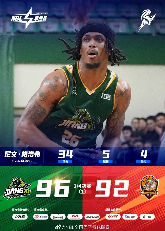 本場季后賽 1/4 決賽首戰(zhàn),雙方開局膠著,江西鯨裕清酒次節(jié)進(jìn)攻熄火陷入低迷,上半場落于被動;易邊再戰(zhàn), 26 號尼文-格洛弗徹底爆發(fā),單節(jié)狂砍主導(dǎo)進(jìn)攻,帶領(lǐng)球隊(duì)掀起反撲狂瀾,一舉扭轉(zhuǎn)場上局勢;末節(jié)決戰(zhàn),江西鯨裕清酒全隊(duì)穩(wěn)扎穩(wěn)打,牢牢把控勝局,最終以96-92主場取勝。