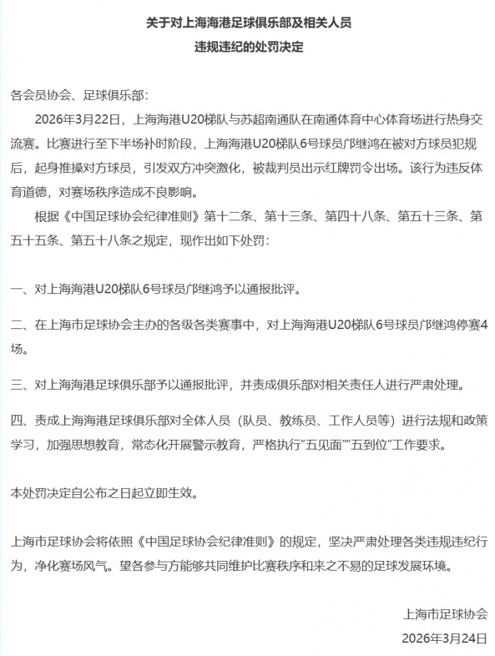直播吧03月24日訊 上海市足協(xié)今日發(fā)布處罰公告,對海港U20球員鄺繼鴻停賽4場。海港U20與蘇超南通隊的熱身賽中,鄺繼鴻在被犯規(guī)后起身推搡對手,引發(fā)大規(guī)模沖突,被直紅罰下。