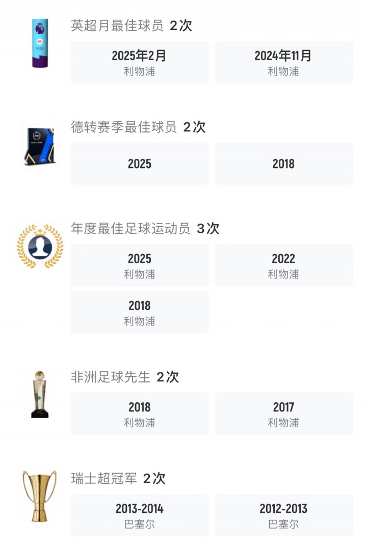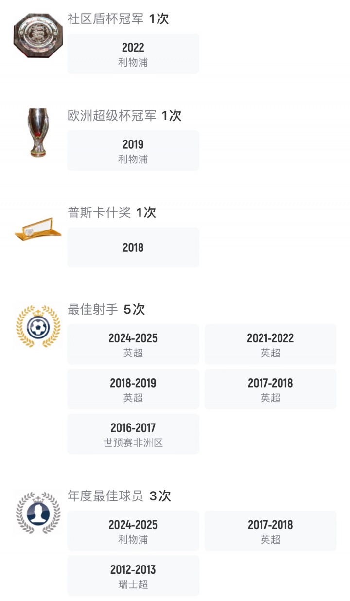個(gè)人榮譽(yù):4次英超金靴、3次PFA年度最佳球員、2次非洲足球先生、1次普斯卡什獎(jiǎng)。